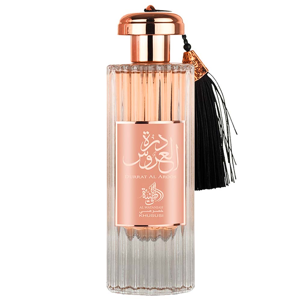 Durrat Al Aroos de Al Wataniah é um perfume Âmbar Feminino. Esta é uma nova fragrância. Durrat Al Aroos foi lançada em 2022. As notas de topo são: Almíscar Branco e Nagarmota ou Óleo de Cipriol. As notas de coração são: Baunilha, Cardamomo e Açafrão. As notas de fundo são: Cumarina e Madeira Guaiac.